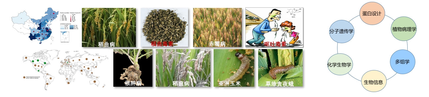 基于多组学和大数据的抗病虫基因挖掘和应用技术,抗病虫种质的创制、基于蛋白结构的人工设计、抗性小分子的分离鉴定。